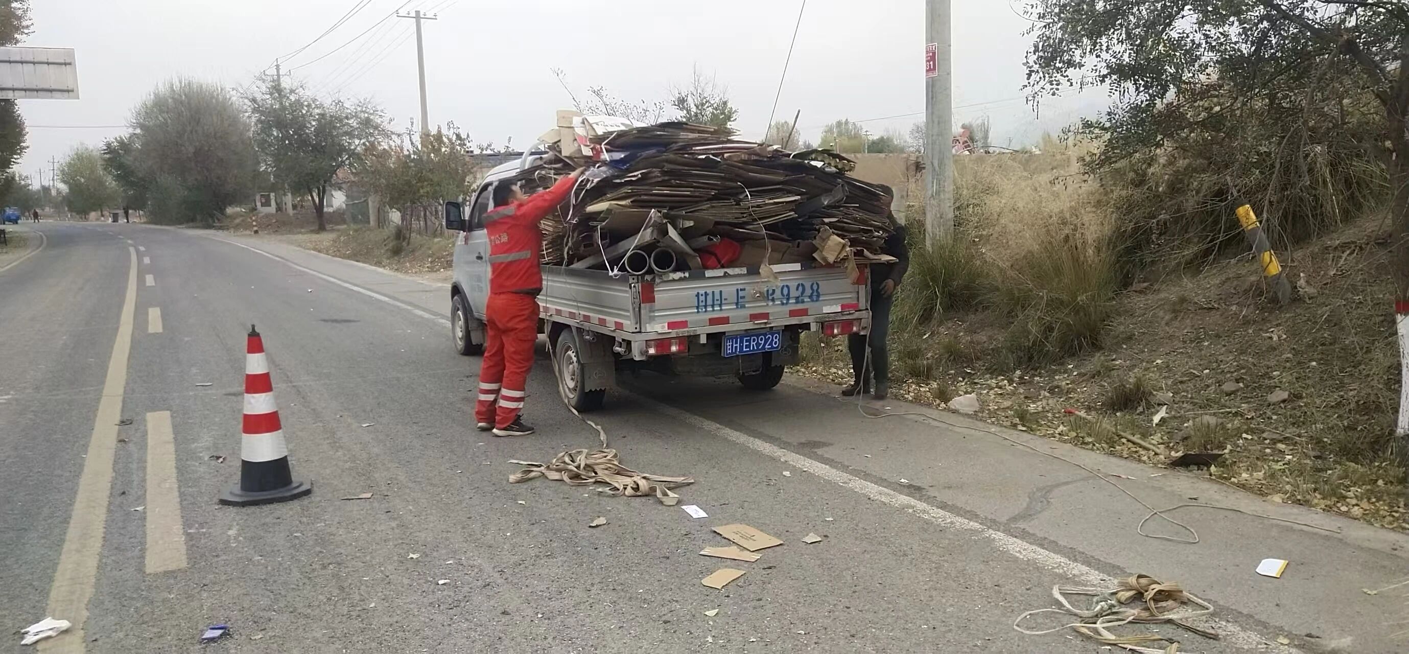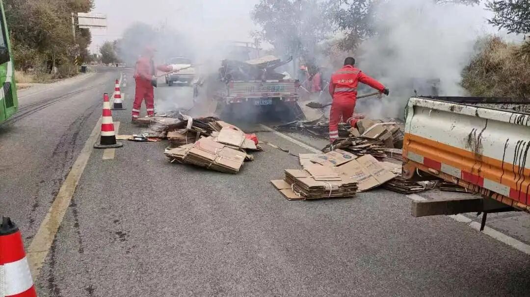巡查人员立即响应,迅速鸣笛、喊话引导货车安全靠边停车。随后,两名职工迅速在起火点前后设置警示标志,做好现场安全布控,疏导过往车流有序绕行;其余人员立即上前,协助车主将未起火的纸箱从车厢搬移至路面安全处,再转身扑向火源。有的俯身铲起路边沙土覆盖明火,有的手持铁锹拍打边缘火星,大家默契配合、动作利落,原本肆虐的火苗在齐心协力下逐渐减弱。经过近20分钟的紧张处置,明火被彻底扑灭。