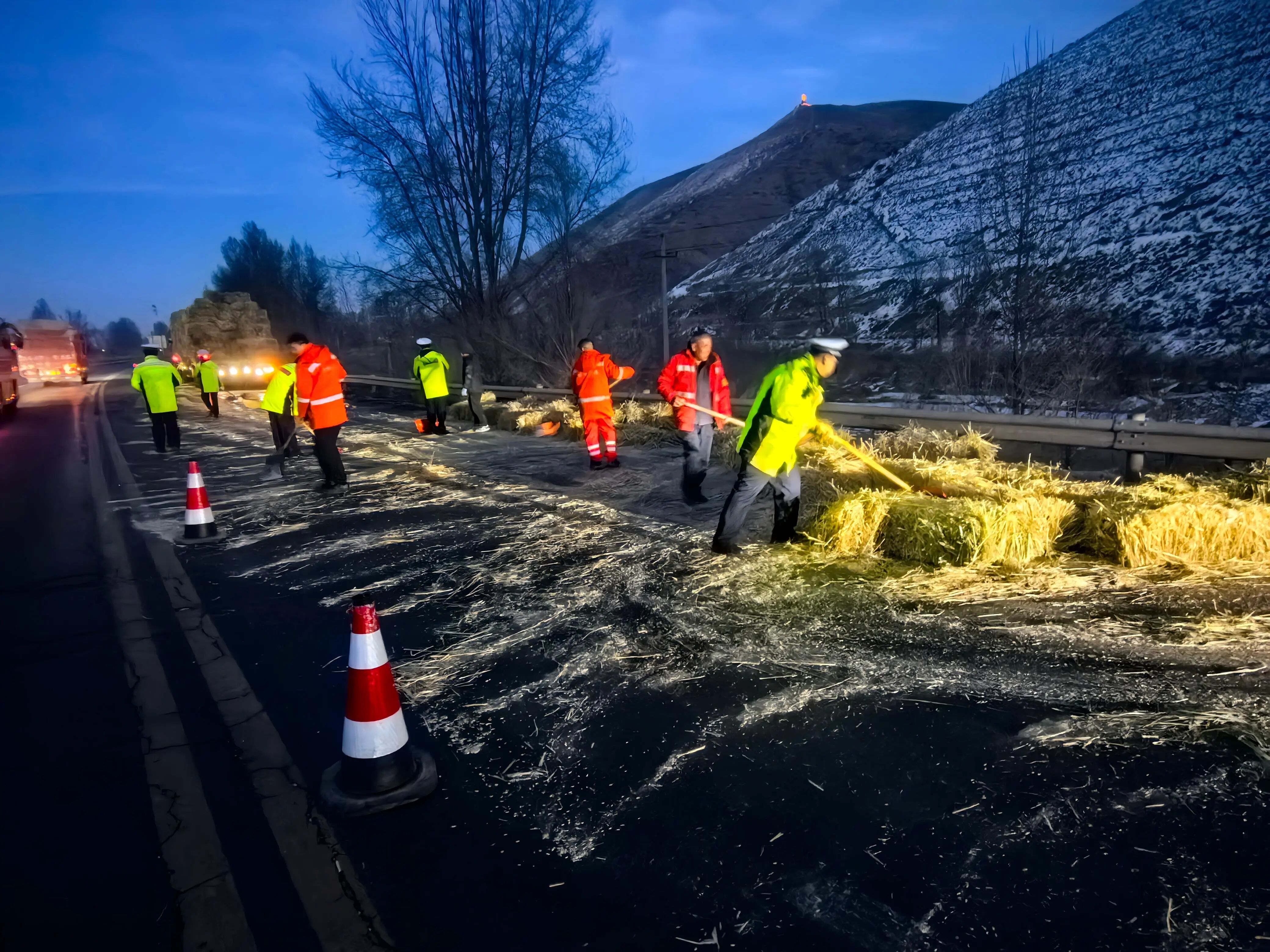“师傅别慌,我们来帮你!”巡查人员迅速下车,一边安抚惊惶的货车司机,一边摸清情况:草料因装载不牢洒落,原车辆已无法承载剩余货物。古浪养护工区副区长王福山当机立断:联系周边货车协助转运,同时迅速设置警示标志标牌、摆放好安全锥桶,并及时联系交警疏导交通,拉起安全“防线”,职工们默契分工,橘色的反光服在车灯下不停穿梭,成了寒夜里最醒目的“安全色”。没有专业工具,大家就徒手扒搂、合力扛抱,将散落在路面的草料一捆捆收拢、装车。寒风吹透了衣背,草屑沾满了手套,但没人放慢动作。“早一分钟清理完,路就早一分钟安全”。近一个小时的协作后,所有草料被妥善转运,路面恢复畅通,车主紧紧握住职工们的手连声道谢,而职工们拍了拍身上的草屑,轻声说道:“这只是我们的日常。”王福山擦了擦额头的汗说道“保通保畅,就是要在岗、在行、在状态!”