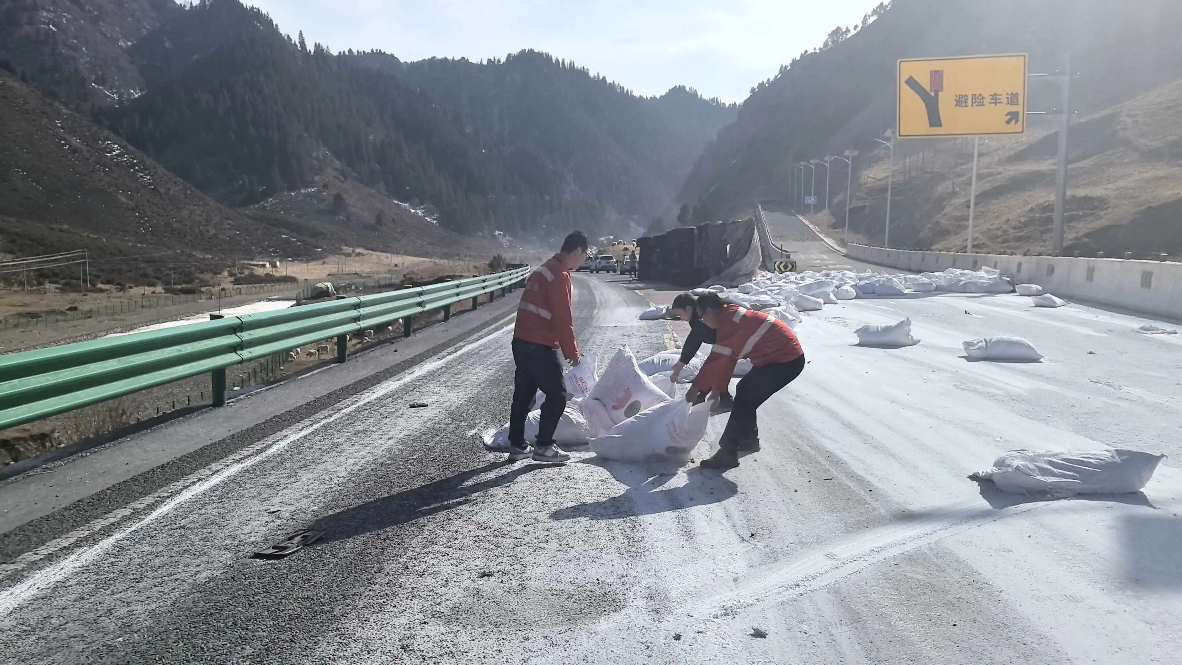 3月11日,G338线天祝至互助段发生一起交通事故。一辆满载木薯淀粉的重型半挂货车突然侧翻,巨大的冲击力使得大量袋装淀粉倾泻而出,铺满了路面,现场一片狼藉。