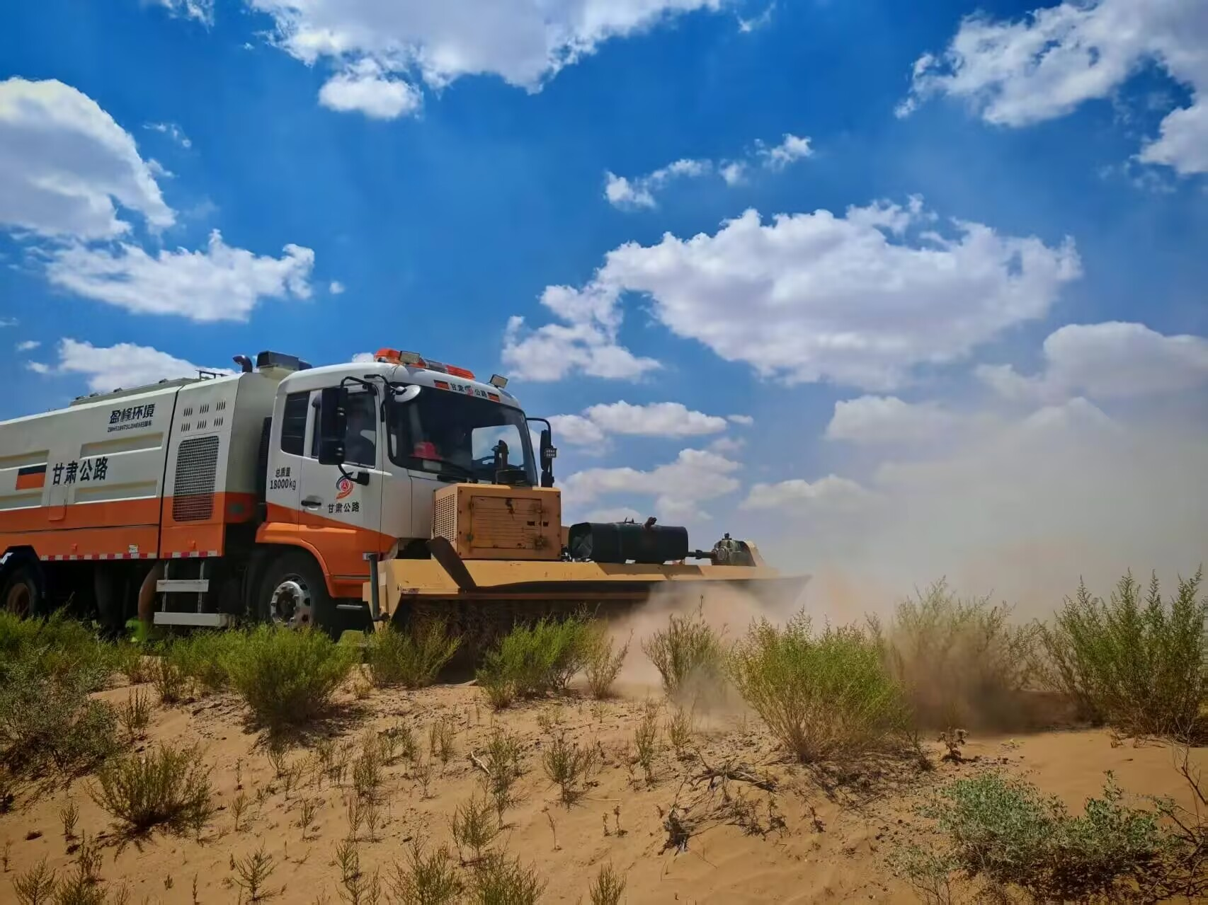 绿色养护,打造品牌。推广绿色生态养护理念,将生态治理与公路养护有机融合,践行“五个一线治沙工作法”(沙漠治理的方案在一线制定,流沙治理的方法在一线寻找,治沙效果在一线检验、党员作用在一线发挥、党员党性在一线锤炼),结合乡村振兴、农村人居环境综合整治,在不雇佣劳务队,降低养护成本的前提下,提前布置,全员投入,利用碎片化时间进行路基边坡整修,并在高温天气下全力清理上路流沙,进行草方格压沙39300平方米、撒播沙米种子20千克,流沙清理102立方米。对G569线青土湖砂砾路段进行了推土整平和洒水降尘7980平方米,倾力打造“四季常绿、三季有花”的沙漠景观路和绿色生态示范路。