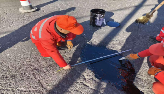 在路面维修现场,坚持“对症下药、分类施治”原则,针对小坑槽、表层脱皮及轻度龟网裂,采用“冷补料修补+网裂贴加铺”的组合工艺全面处治;对轮迹带等荷载集中区域的坑槽,升级为“界面剂+冷补料+抗裂贴加固”的强化方案;对于网裂较严重的路段,直接选用高强度抗裂贴进行预防性补强。通过精准化处治工艺,有效阻断了水分渗透和荷载反复作用对路面的持续破坏,从源头遏制了病害向深层发展。