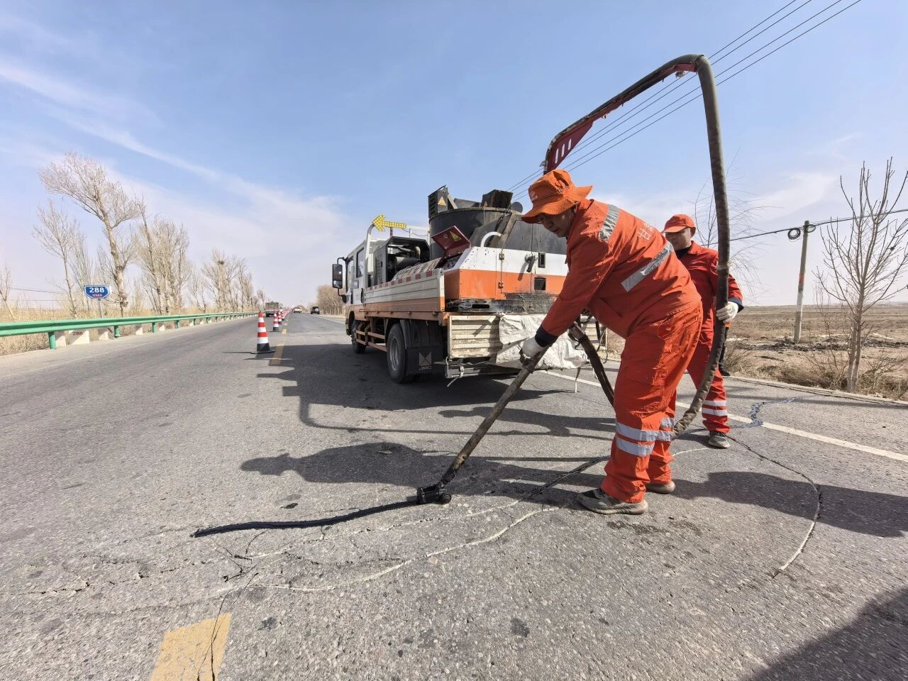春风拂沙海,植绿正当时。随着“请到民勤种棵树”公益治沙活动的全面开展,武威公路事业发展中心民勤公路段紧扣公路养护中心工作,抓实抓细路面灌缝这项春季养护重点任务,同步推进路域环境整治等作业,既为公益活动参与者营造安全顺畅的出行环境,也全力守护春耕生产、群众出行和地方发展的交通命脉,以日复一日的坚守和平凡的担当筑牢道路安全通行屏障。
