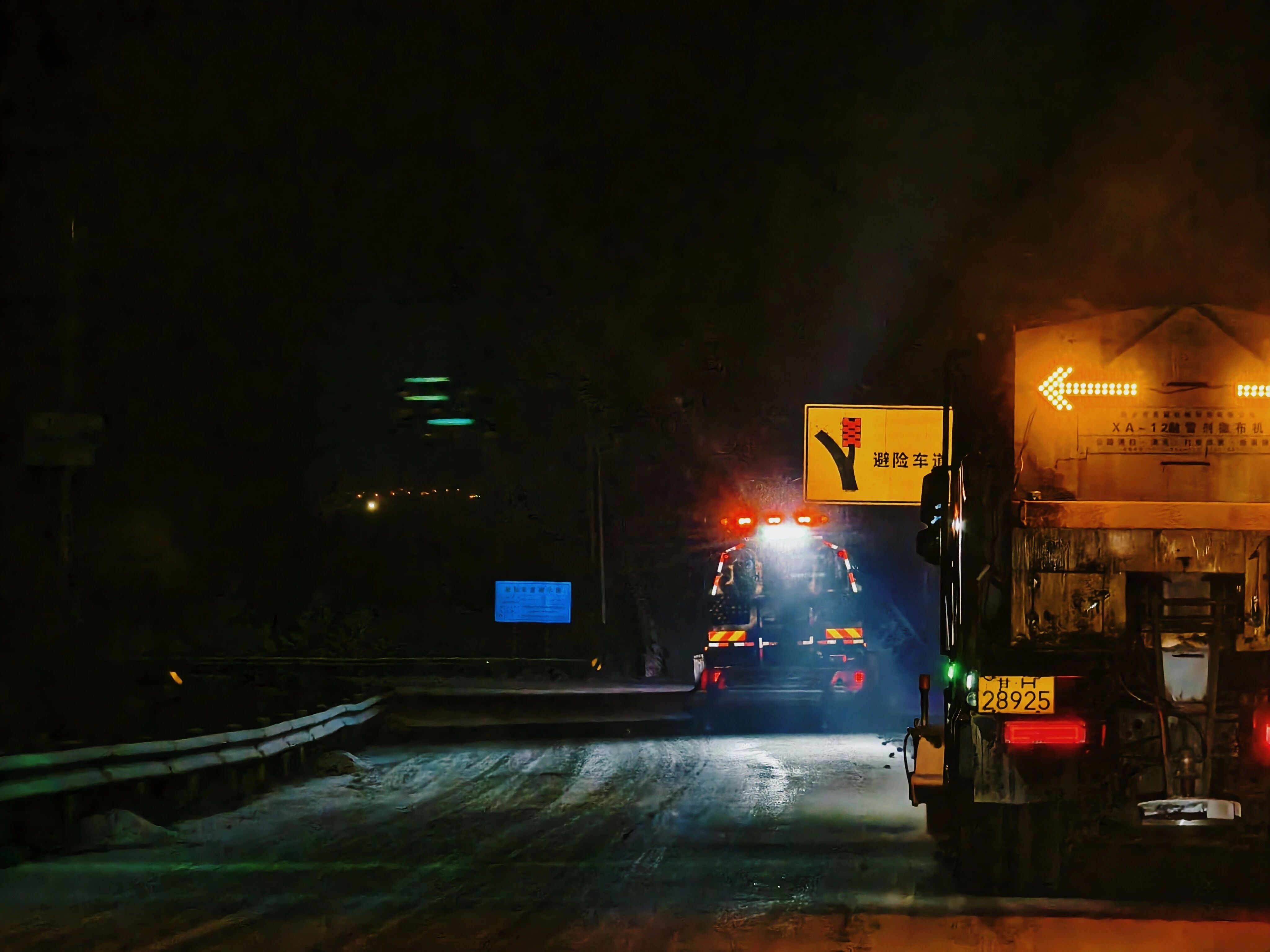 没有号角,只有引擎持续的低吼与风声的合鸣。撒布机紧随其后,防滑料均匀地铺洒在新露出的路面上,敲击出细密的沙沙声,那是安全与畅通的序曲。他们的身影在雪雾与车灯的光束里晃动,检查、疏导、协助……每个人的动作都因低温而略显凝滞,呼出的白气瞬间被风撕碎,但脚步没有停顿。在这里,“保畅”不是口号,是机械与人力对抗自然伟力的、每一分钟的实践。风依旧试图抹平刚刚开辟的轨迹,雪也在不断企图重新占领失地,但这一列钢铁与意志组成的队伍,缓慢却不可逆转地向前推进。我们多走一尺,身后的归途便坦荡一丈。