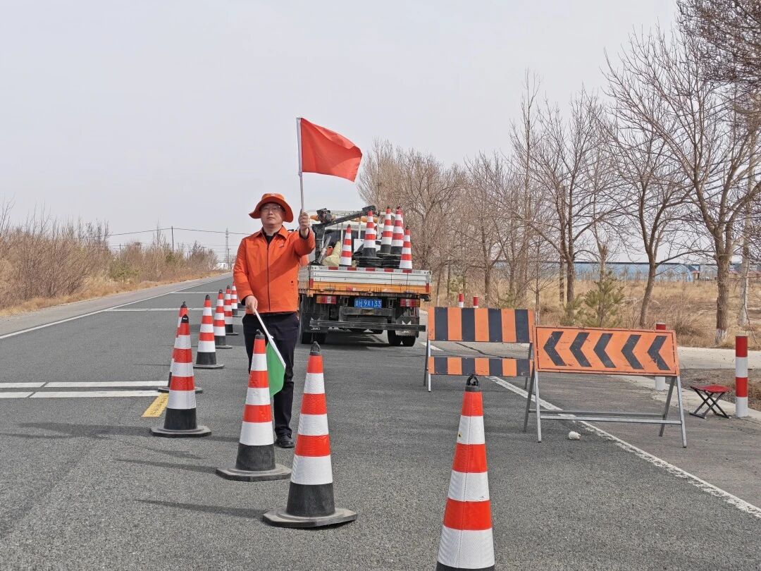 公路裂缝处治作业点多、线长,且作业区域车流密集、视线复杂,安全保障工作容不得半点疏忽。为筑牢作业现场的安全防线,于有威、董泽斌严格按照《公路养护安全作业规程》,规范布设安全警示标志,提前排查现场安全隐患,细致开展岗前安全交底。作业过程中,他们手持红绿指挥旗,往返巡查于作业区与车流之间,不间断提醒作业人员、引导过往车辆,哪怕春风料峭、风沙扑面,也始终坚守岗位,从未离岗半步。从晨光熹微到暮色降临,他们用脚步丈量作业路段,用责任守护现场安全,将军人的担当与坚守融入养护安全工作的每一个细节,为裂缝处治作业顺利推进保驾护航。