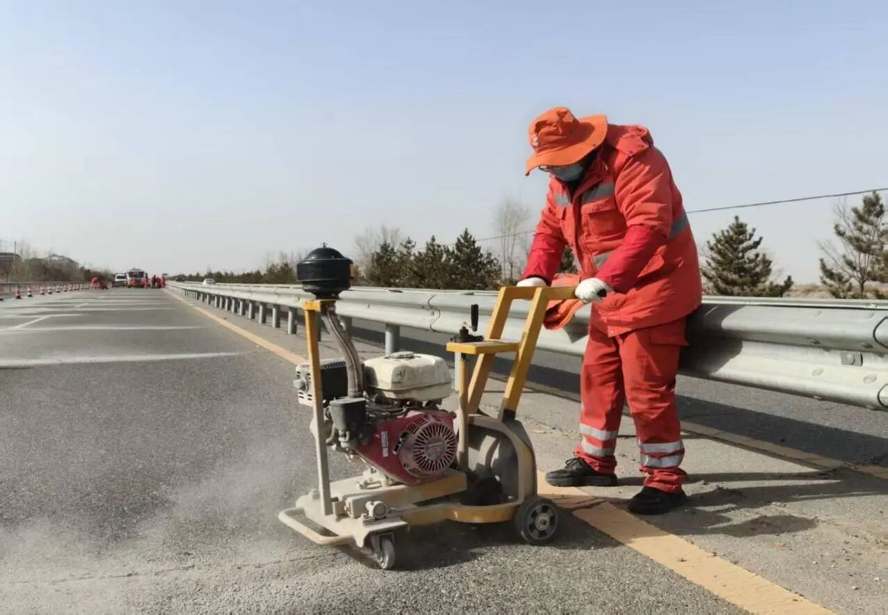 协作中的专业与辛劳。在测量的间隙,我得以仔细观察整个灌缝作业的流水线。身边不远处的同事们各司其职,构成了一幅动人的劳动画卷。开缝的同事推着开缝机,全神贯注地沿着裂缝前进,尖锐的刀具在坚硬的沥青上刻出整齐的凹槽,扬起的灰尘很快便沾满了他的工装。紧随其后的灌缝工作人员更是辛苦,他们不仅要忍受灌缝料枪头喷涌而出的高温热浪,还要时刻注意灌缝的饱满度和均匀性,确保每一道裂缝都被完美地填充。而在我们身后,负责交通指挥的同事更是眼观六路、耳听八方,他们挥舞着旗帜,引导车辆减速慢行,用坚实的背影为我们筑起了一道安全的屏障。每一个看似简单的环节,都凝聚着专注与责任。