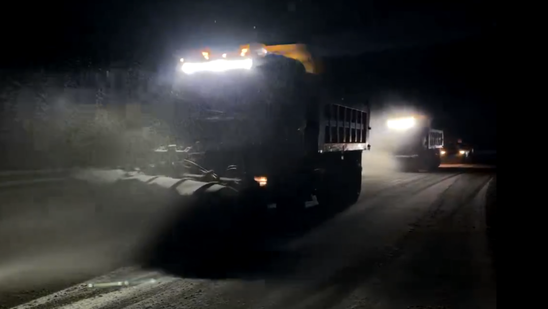 10月25日中午,天祝县境内天气短暂转晴,当日下午18时左右,该区域再次迎来降雪,且由于前期积雪融化,路面湿度较大,夜间气温下降后道路结冰概率大幅上升。面对路面夜间结冰的复杂情况,中心果断调整工作部署,养护人员放弃休息、连夜作战,通过均匀撒布融雪剂,提前降低路面结冰风险,最大限度减少冰雪对公路通行的影响。