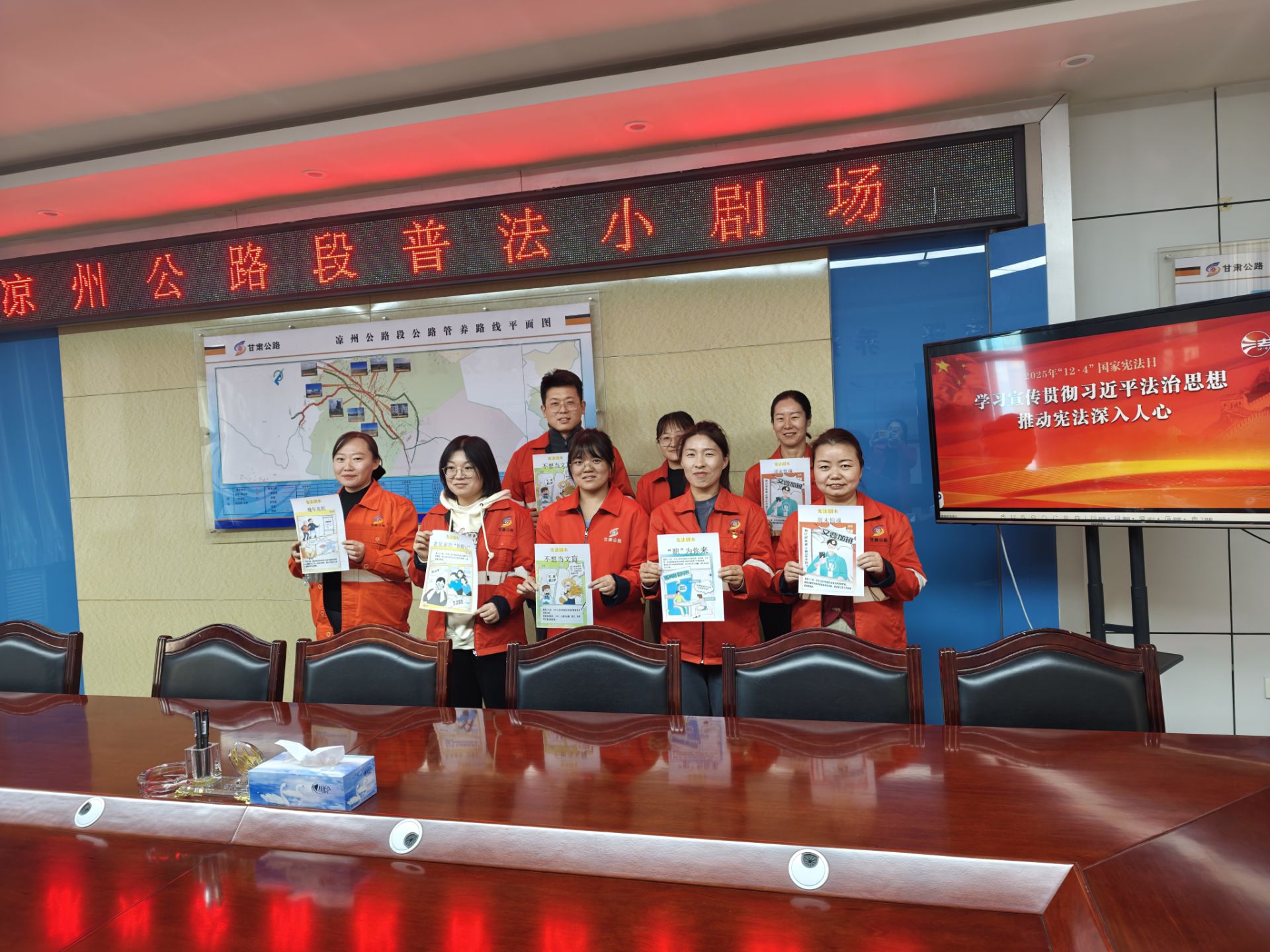 创新载体,浸润法治精神。中心立足行业特点,创新宣传形式,丰富宣传载体,构建全方位、多层次、广覆盖的宣传矩阵。各基层单位打造“固定+流动”立体宣传矩阵,在养护站、办公区悬挂宣传标语,通过LED显示屏滚动播放宪法公益广告,让宪法精神抬头可见、触手可及。古浪公路段参加古浪县举办“12·4”国家宪法日“宪法宣传周”启动仪式,向周边群众发放宣传册、提供法律服务。天祝公路段组织开展“宪法宣传进社区”主题活动,将宪法知识与公路养护行业法规送到群众身边、融入百姓生活。凉州公路段创新推出“普法小剧场”活动,采用时下流行的“剧本游戏”模式,进行情景演绎,用沉浸式、互动式的普法体验,调动干部职工的参与热情。民勤公路段依托养护站、公路沿线乡镇等一线阵地,向过往司乘、沿线群众发放宪法宣传与公路法治常识彩页,用“家常话”解读路产保护、应急救援服务等热点问题,让群众在互动交流中感受法治力量,全力营造“人人学宪法、时时谈法治的浓厚氛围”。