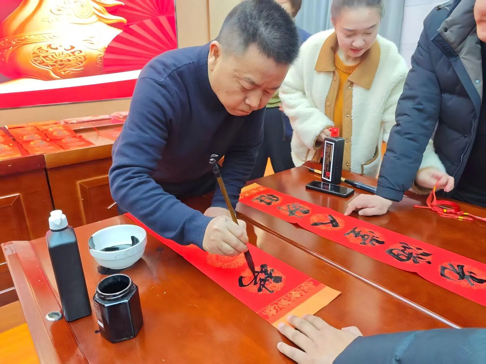 春联寄情传关爱,同心聚力迎新春。后勤服务中心举办“笔墨迎春”送春联送祝福活动,以笔墨为媒传递温情,为即将到来的新春佳节筑牢幸福底色。活动现场,书法爱好者们凝神聚气、笔力遒劲,饱蘸浓墨的毛笔在大红色春联纸上落笔生花,传统春联对仗工整、寓意吉祥,字里行间饱含对新春的美好期许和对职工平安顺遂的真挚祝愿。
