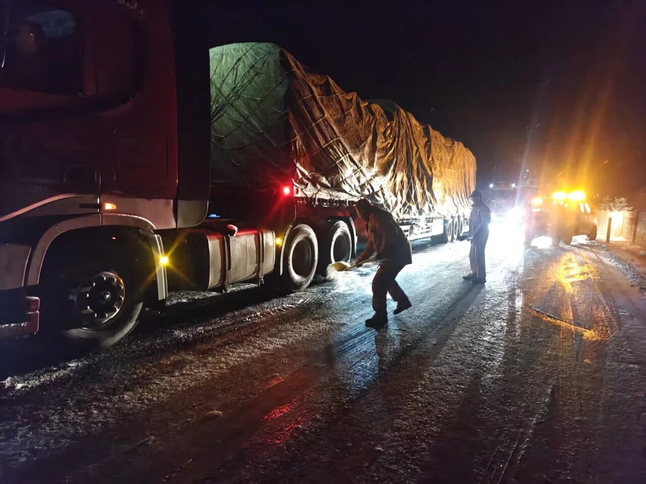 降雪伊始,天祝公路段严格按照“1044”除雪保畅规程,连夜集结队伍,以“雪情就是命令,保畅就是责任”的使命担当,迅速奔赴各积雪路段开展除雪保畅作业。作业过程中,坚持“机械为主、人工为辅、人机协同、高效联动”的作业模式,对G338线五台岭、G312线乌鞘岭等路段积雪进行全面清理,在急弯陡坡、隧道出入口等,加密防滑料、融雪剂撒布频次,加速路面积雪融化,有效消除路面结冰隐患,提升道路抗滑性能。全体养护人员顶寒风、踏积雪,昼夜奋战在保畅一线,最大限度降低降雪天气对道路通行带来的影响,确保过往车辆安全有序通行。