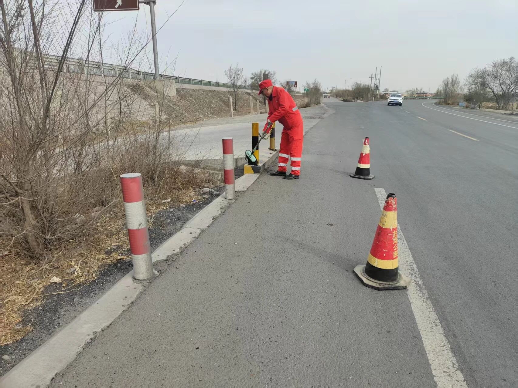 G312线古浪路段,云层低低地压着,偶有一缕暖阳穿过云隙落在路面,路边不远处就是庄严肃穆的古浪战役纪念馆,清明假期,前来缅怀先烈的车辆络绎不绝。古浪养护工区区长王福山正弯腰排查一块警示标牌的固定情况,戈壁的风卷着干燥的气息扑面而来,把他身上的橘色工作服吹得微微鼓起。